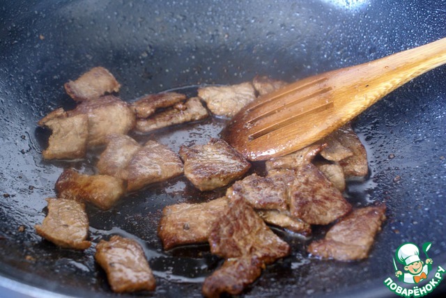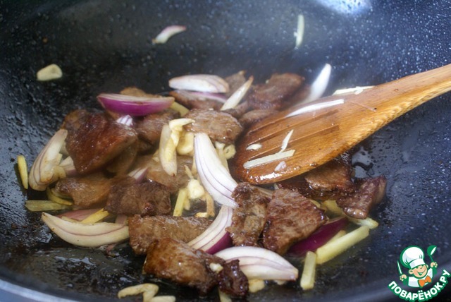 Дальше все делается очень быстро. Сильно разогреть вок с небольшим количеством растительного масла и быстро обжарить говядину до зарумянивания.
