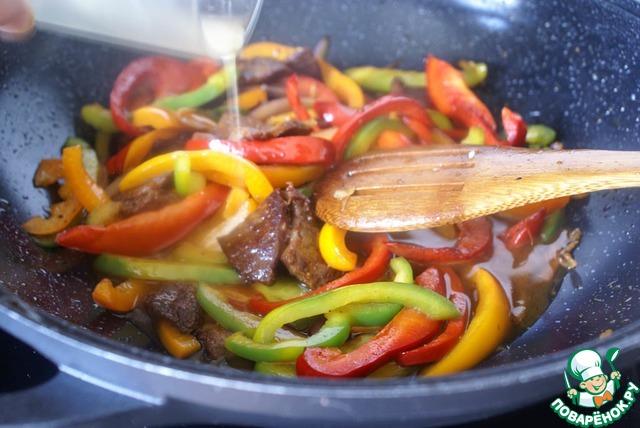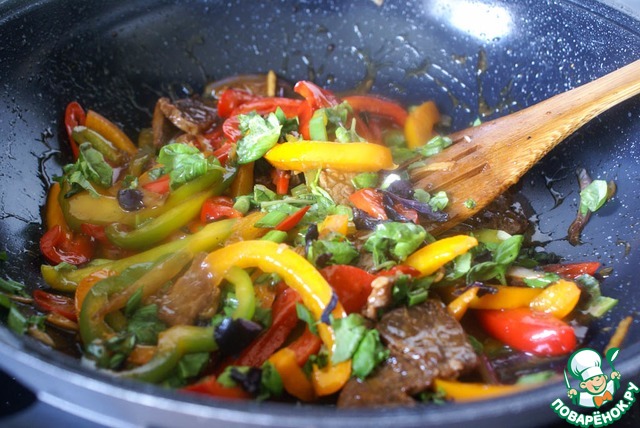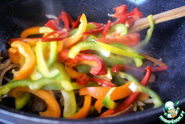 Добавить перцы, обжаривать все вместе еще 2-3 минуты. Перцы должны остаться хрустящими.