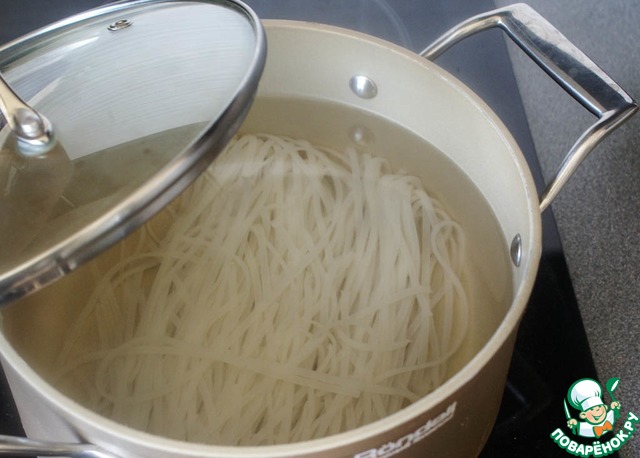 Рисовую лапшу опустить в подсоленную кипящую воду, выключить огонь, накрыть крышкой и дать настояться 3-4 минуты. Готовую лапшу откинуть на дуршлаг, промыть холодной водой и заправить ложкой растительного масла.