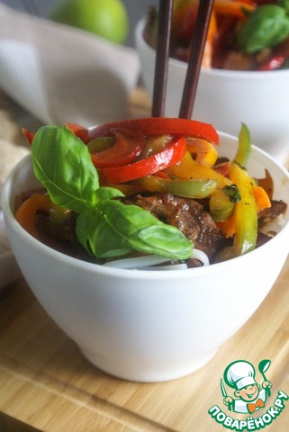 В порционную посуду выложить лапшу, наверх говядину с овощами и соусом и украсить веточкой базилика. Это так же вкусно, как и красиво!