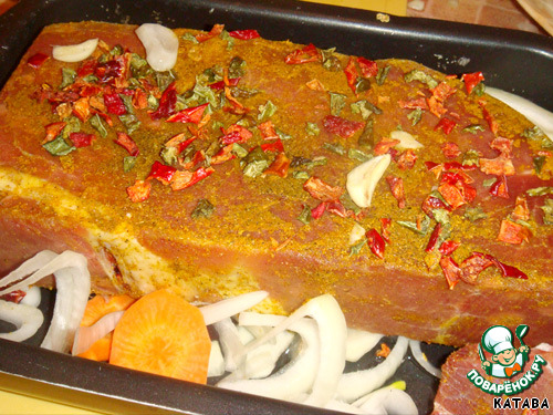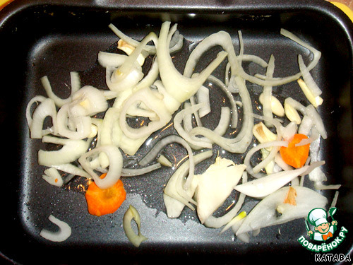 Противень с бортами смазать маслом, на дно выложить кольца лука, чеснок и часть моркови (чтобы мясо не пригорело ко дну)