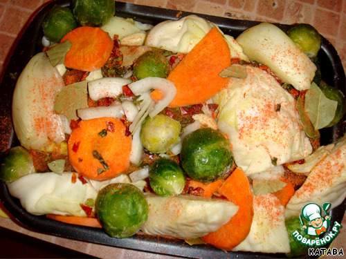 Обкладываем со всех сторон капустой (крупной белокочанной и брюссельской), луком, чесноком и морковью.