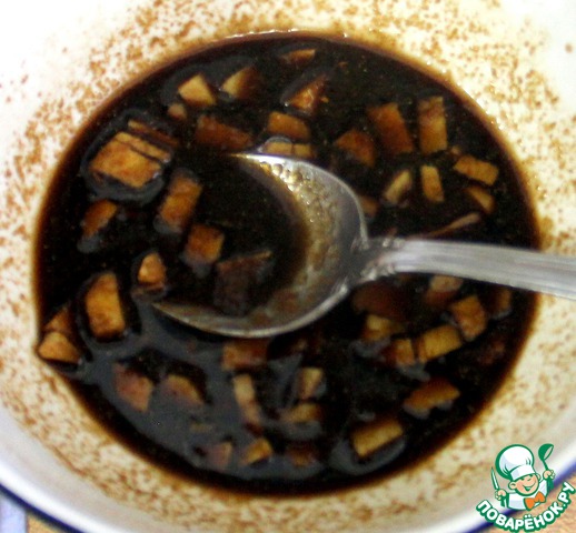 Сначала готовим маринад. Для этого корень имбиря режем на мелкие кубики. В миске смешиваем соевый соус, коричневый сахар, корень имбиря, оливковое масло, вино и крахмал.