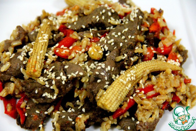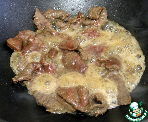 В разогретую глубокую сковороду или вок кладем мясо с остатками соуса и тушим до полуготовности.
