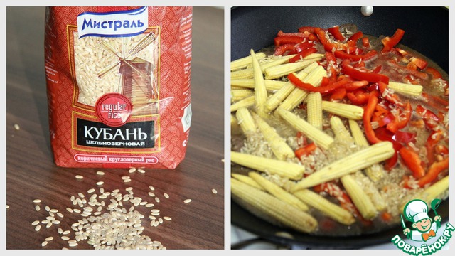 Затем добавляем рис (я использую коричневый рис фирмы "Мистраль"), нарезанный полосками красный перец и кукурузу, добавляем бульон (или воду) так, что бы слегка покрыло и тушим до готовности риса при закрытой крышке на небольшом огне. При желании красный перец можно добавить в конце, за минут 5 до конца. Тогда он будет менее разварившийся. Но мне лично он нравится именно в таком исполнении.