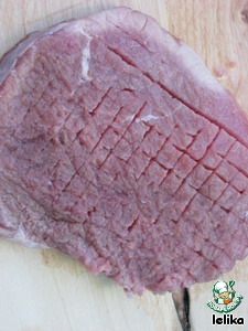 На каждом куске сделать диагональные надрезы, стараясь не прорезать мясо насквозь.