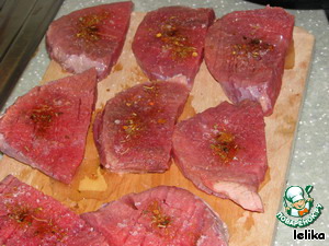 Мясо посолить, втереть в каждый кусок масло, посыпать специями и дать настояться 1 час