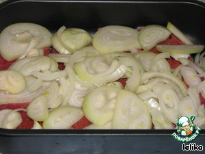 Положить лук поверх мяса, подлить немного воды.