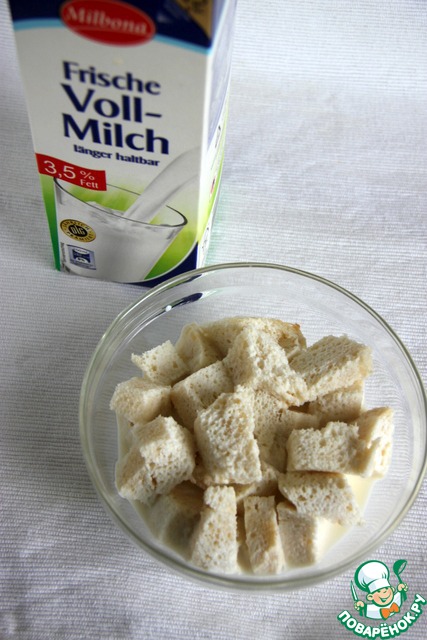 Срезать с чёрствой булочки корочку, нарезать кубиками и полить молоком. Оставить на 10 мин.