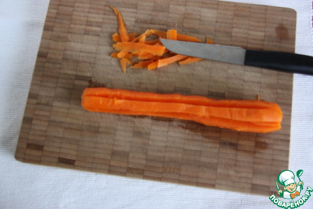 Если рулет готовится праздничный, со звёздочками, тогда заранее отварить морковь, остудить, очистить. Можно вложить её в рулет просто цилиндриком, а можно вырезать "лунки", обозначив звёздочки.