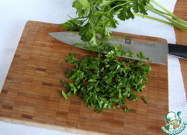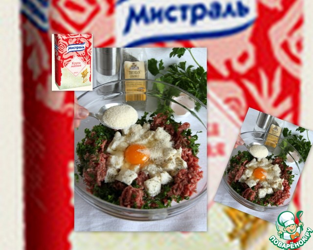 В говяжий фарш добавить яйцо, мелко рубленную зелень петрушки, тимьян, отжатую от молока булочку, соль, перец и манку. Фарш хорошенько вымешать и даже отбить, дать ему постоять минут 10-15. Фарш должен получиться довольно плотным. Если необходимо, добавьте ещё немного манки.