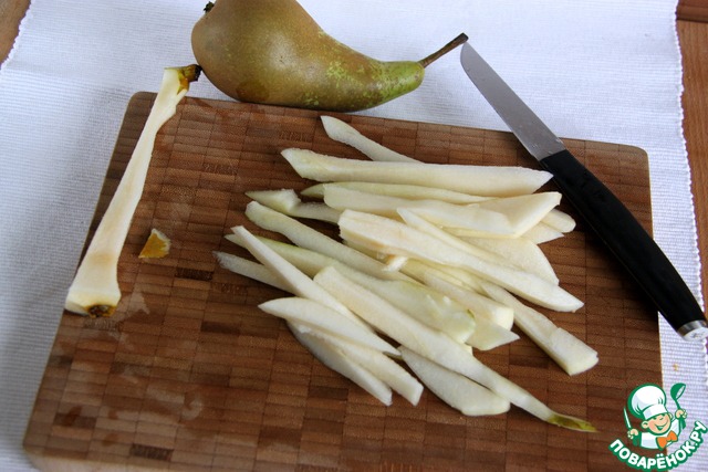 Очистить грушу и нарезать длинными тонкими брусочками.