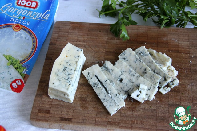 Груша великолепно сочетается со многими мягкими сырами, здесь уже дело вкуса. Горгонзолла и рокфор - более солёные, насыщенные, специфические, дорблю - оригинален, пикантен, прекрасно дополняет грушу. Если готовите с голубыми сырами, то фарш нужно очень экономно солить и приправлять.