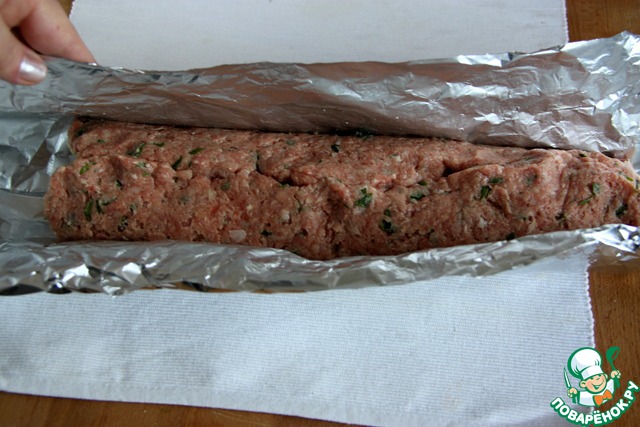 Выложить фарш прямоугольником, толщиной в 1 см на подготовленную фольгу. Вдоль фарша по центру выложить сыр.