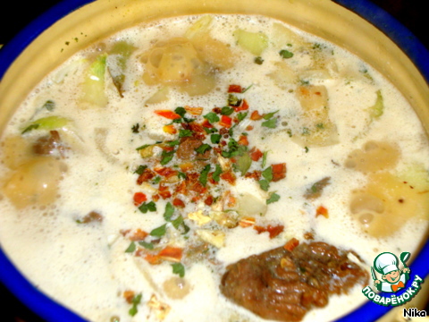 Соус любой - тот, что Вам больше нравится. Мой соус: вода, немного сметаны, кукурузный крахмал, лук репчатый,сухая приправа с корнеплодами и зеленью, лавровый листик.