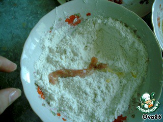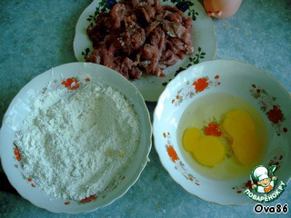 Муку смешать с солью, пряностями и чесноком. Взбить в отдельной посуде яйца.