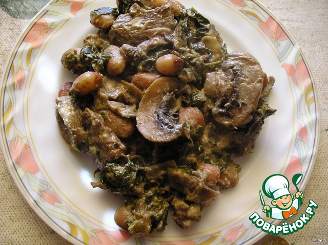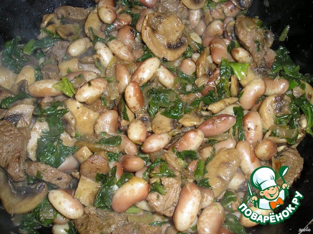 Резанного шпинатика и отваренной фасольки. Обжариваем минуток 5.