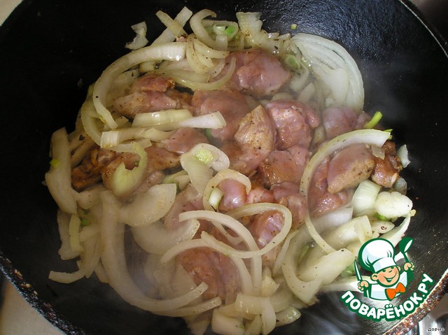 Оставляем промариноваться лук с мяском на пару часиков. Потом обжариваем минуток 10.