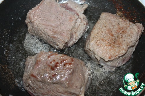 Вырезку говядины разделить на три приблизительно равные части, посолить, поперчить и обжарить на разогретом растительном масле с двух сторон.