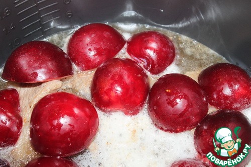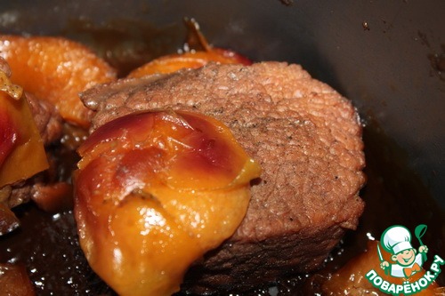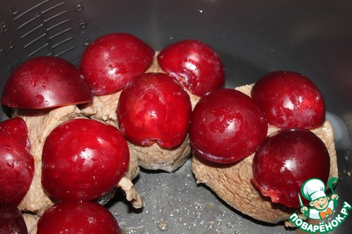 Из слив удалить косточки и с внутренней стороны плоды посыпать сахаром. Сливы уложить на куски обжаренного мяса.