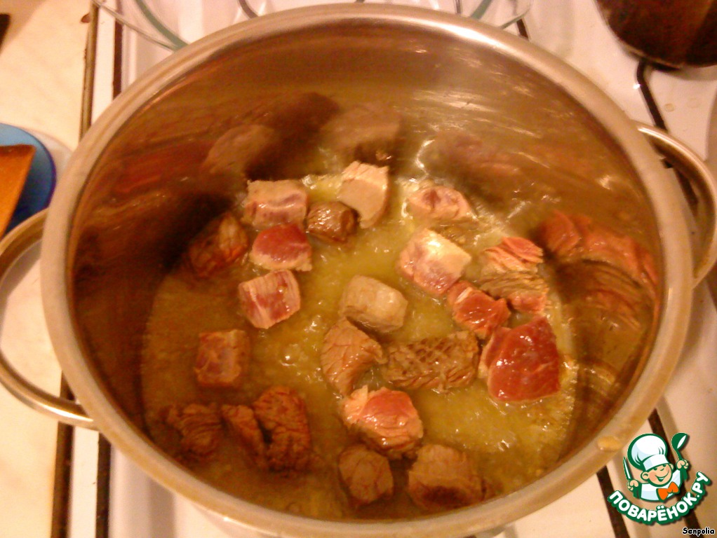 В большой кастрюле разогреваем жир и частями обжариваем мясо. Обжаренные кусочки перекладываем в другую посуду.