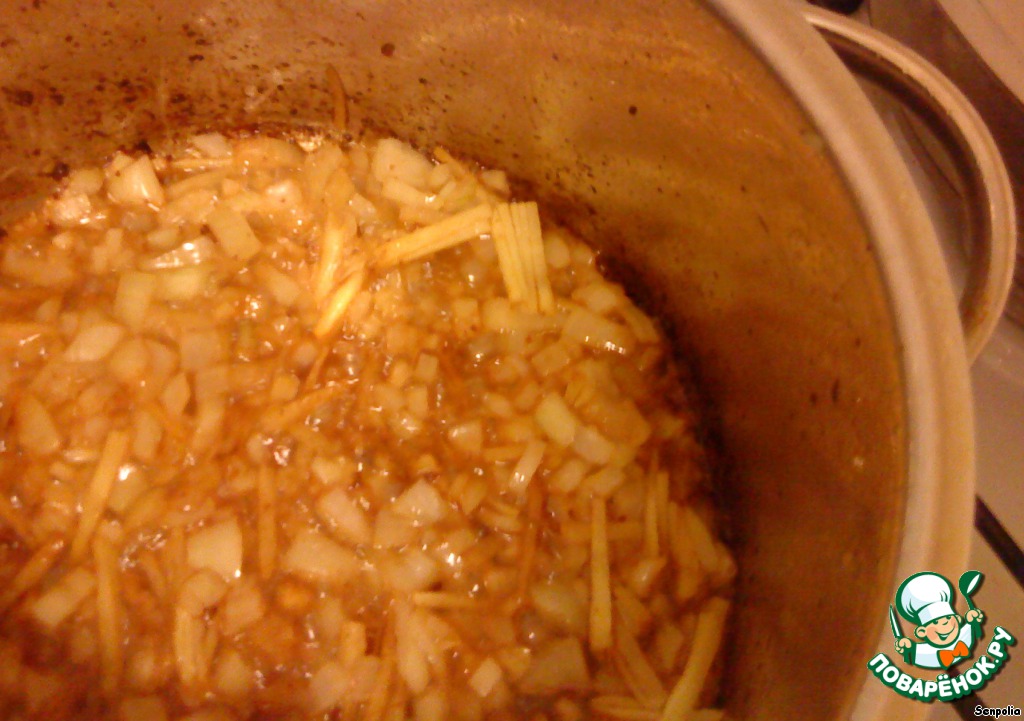 После мяса в кастрюлю отправляем лук, чеснок и имбирь. Обжариваем минут 5, помешивая, потом добавляем 2 ложки карри, семена тмина, соль и обжариваем еще 5 минут.