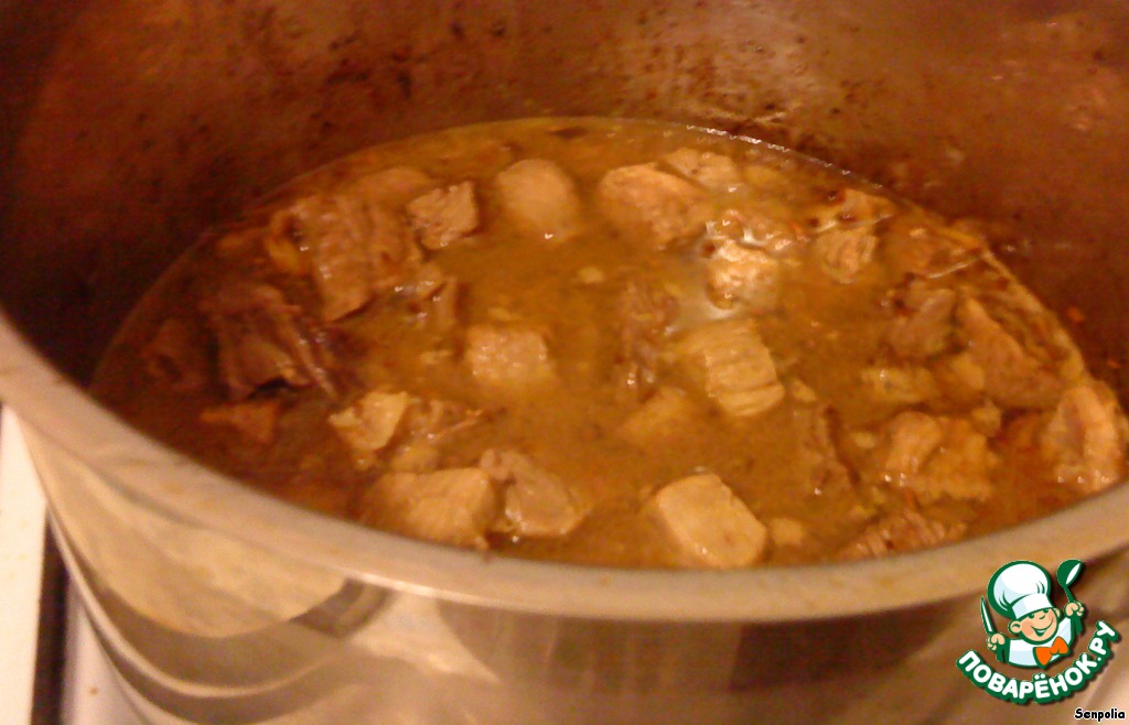 Возвращаем обжаренное мясо в кастрюлю, заливаем стаканом воды, перемешиваем и тушим под крышкой на медленном огне 30 минут.