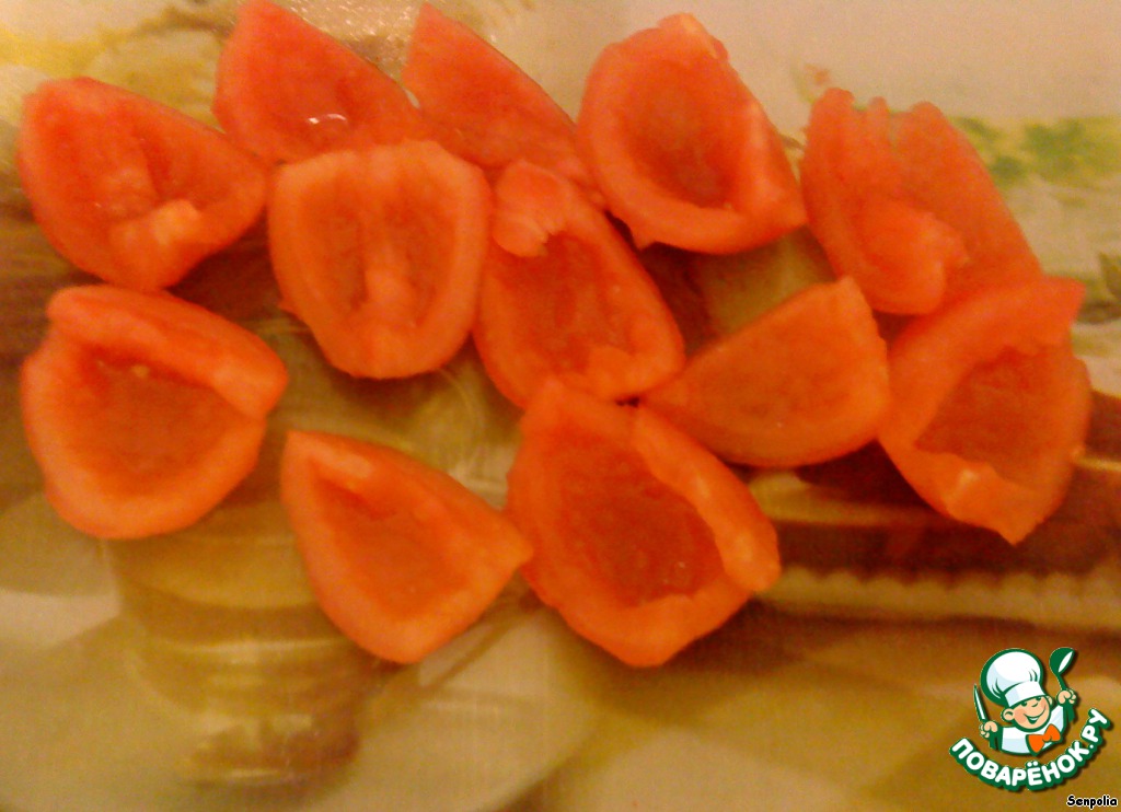 Помидоры ошпариваем кипятком, снимаем кожицу, разрезаемм на 4 части, удаляем серединку и семена.