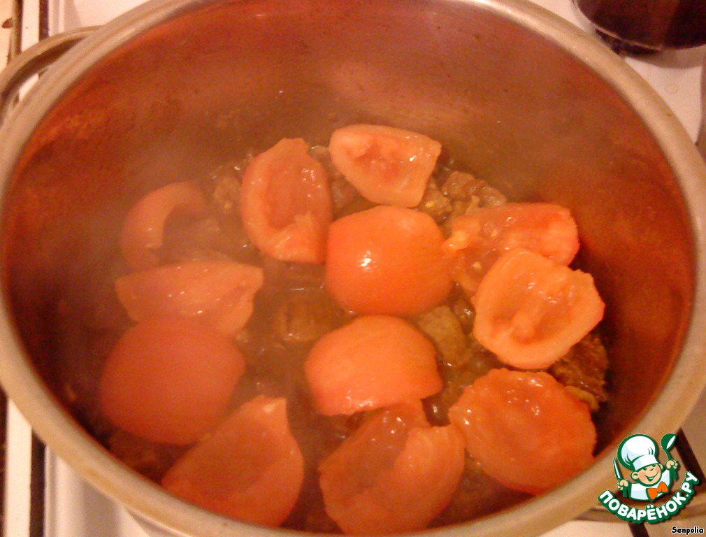 После того, как мясо потушилось полчаса, отправляем к нему подготовленные томаты, перемешиваем, закрываем крышкой и тушим еще полчаса на медленном огне.