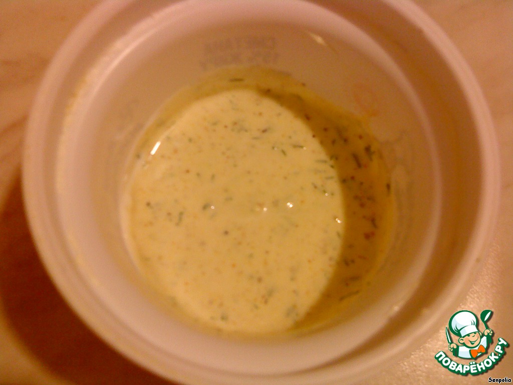 Готовим соус: натуральный йогурт (со сметаной тоже неплохо получилось, думаю, можно и майонез) перемешиваем с чайной ложкой карри (количество приправы зависит от индивидуальных предпочтений) и измельченной зеленью.