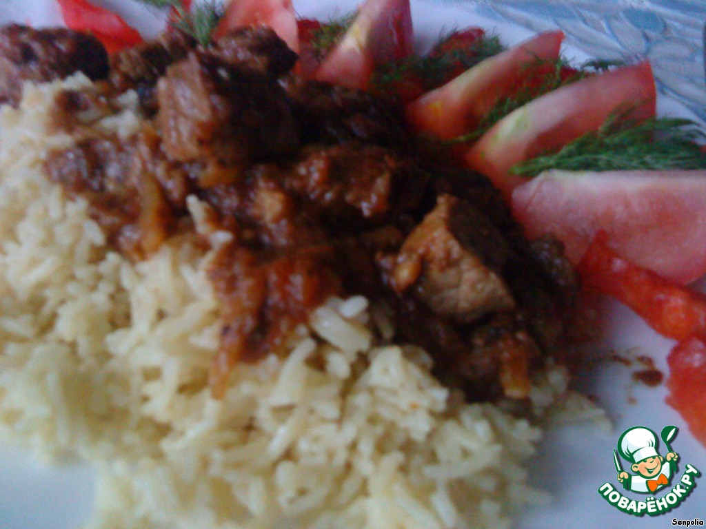 Подаем с рисом басматти и соусом (отдельно в соуснике).