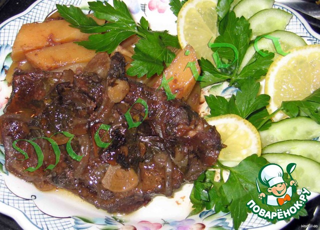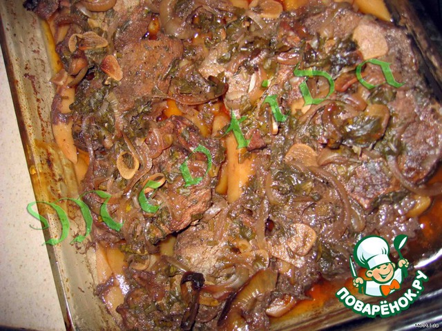| Говядинка, маринованная в вишневом ликерчике… с кусочками лимончика, чесночка и лучка, ну и, конечно, свежая зелень, соль и перчик, а чтобы сразу был гарнир, запекаем мяско вместе с картошечкой… получается вкуснейшее, нежнейшее и необычнейшее блюдо... Блюдо вполне достойное праздничного стола! |