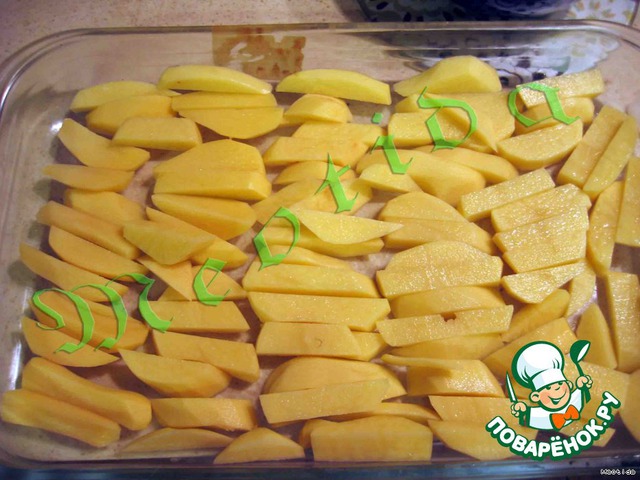 В форму для выпекания выкладываем слой крупно порезанного картофеля.