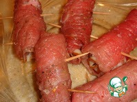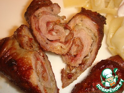 Отбивные немного солим, перчим, натираем чесноком, выдавленным через чеснокадавку. На мясо укладываем пластики бекона и сворачиваем рулетом.
