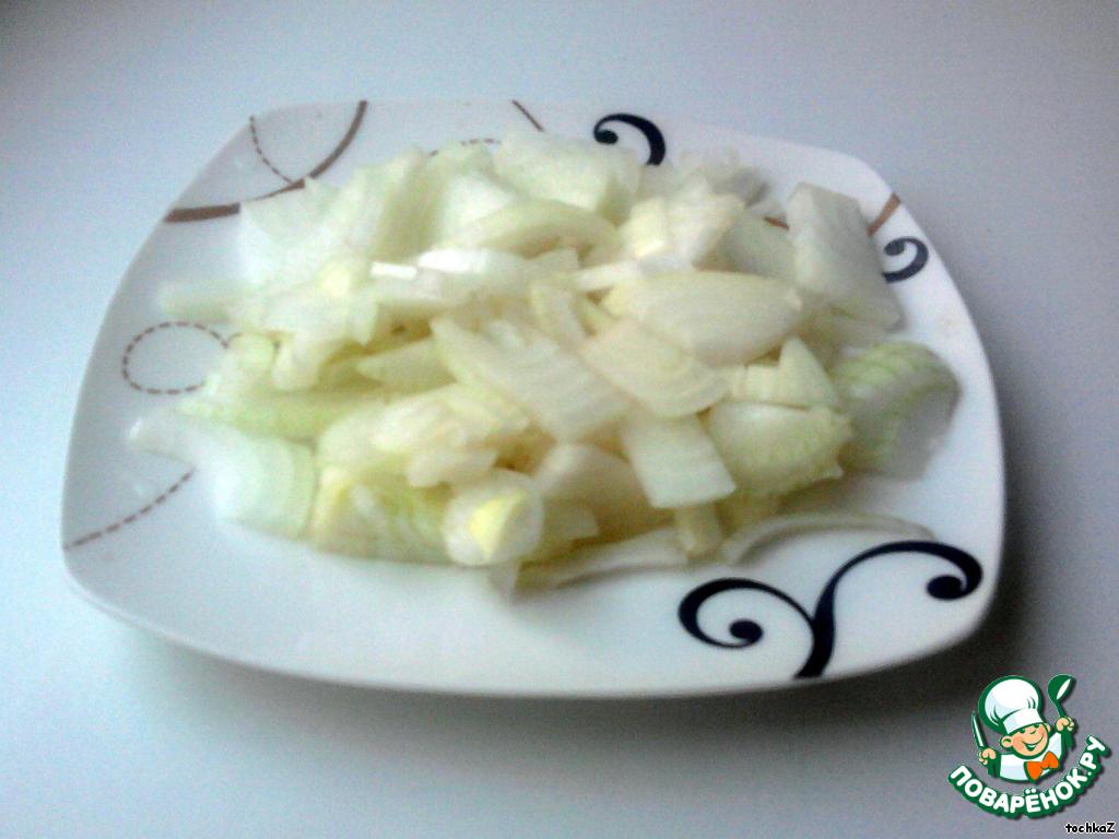 Большую луковицу разрезаем пополам и режем четвертинками колец.