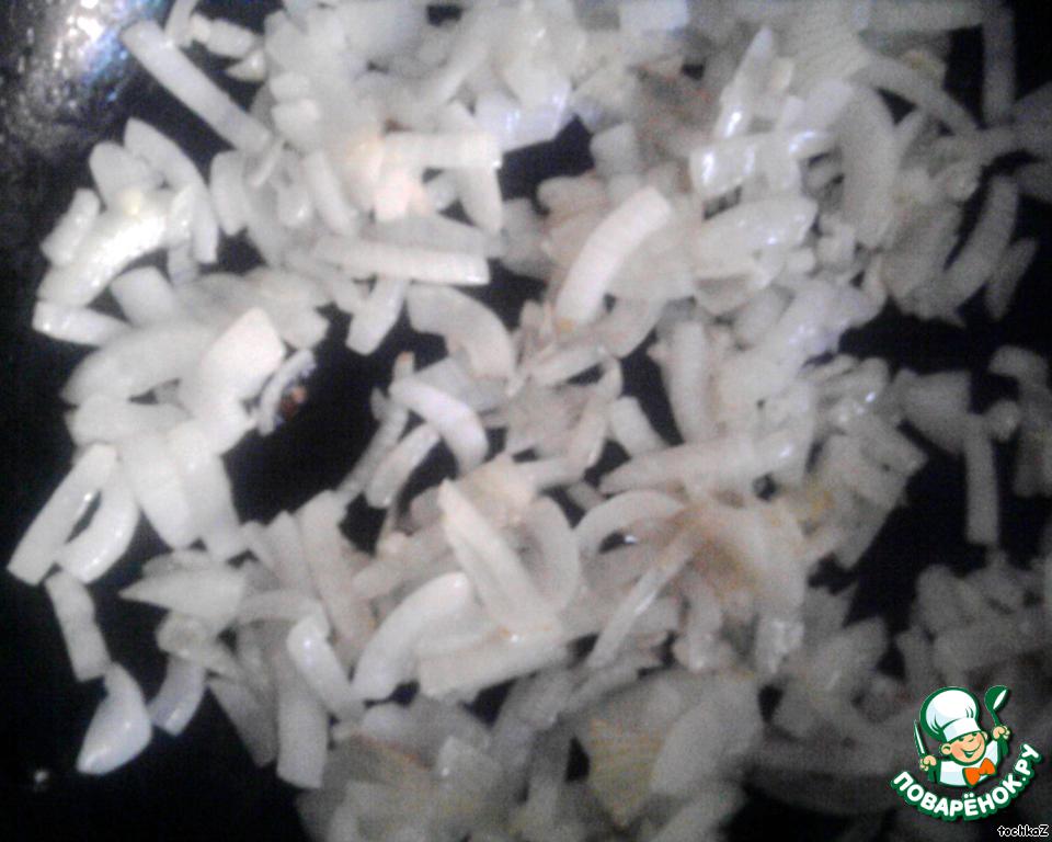 На раскаленную сковороду наливаем подсолнечное масло и обжариваем лук и чеснок до прозрачности лука.