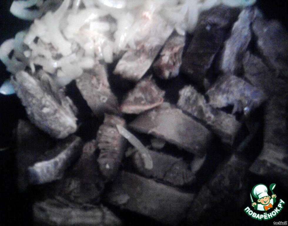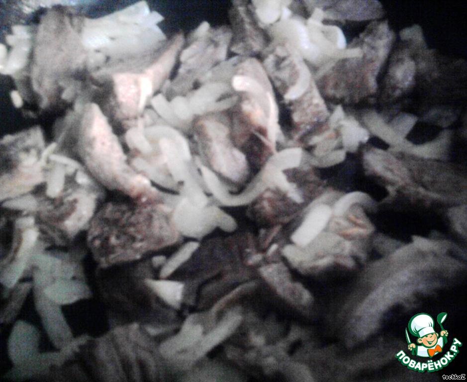 Добавляем порезанное мясо, немного обжариваем со всех сторон кусочки. Я сдвигаю на сковороде лук в сторонку и на освободившееся место выкладываю мясо для обжарки.