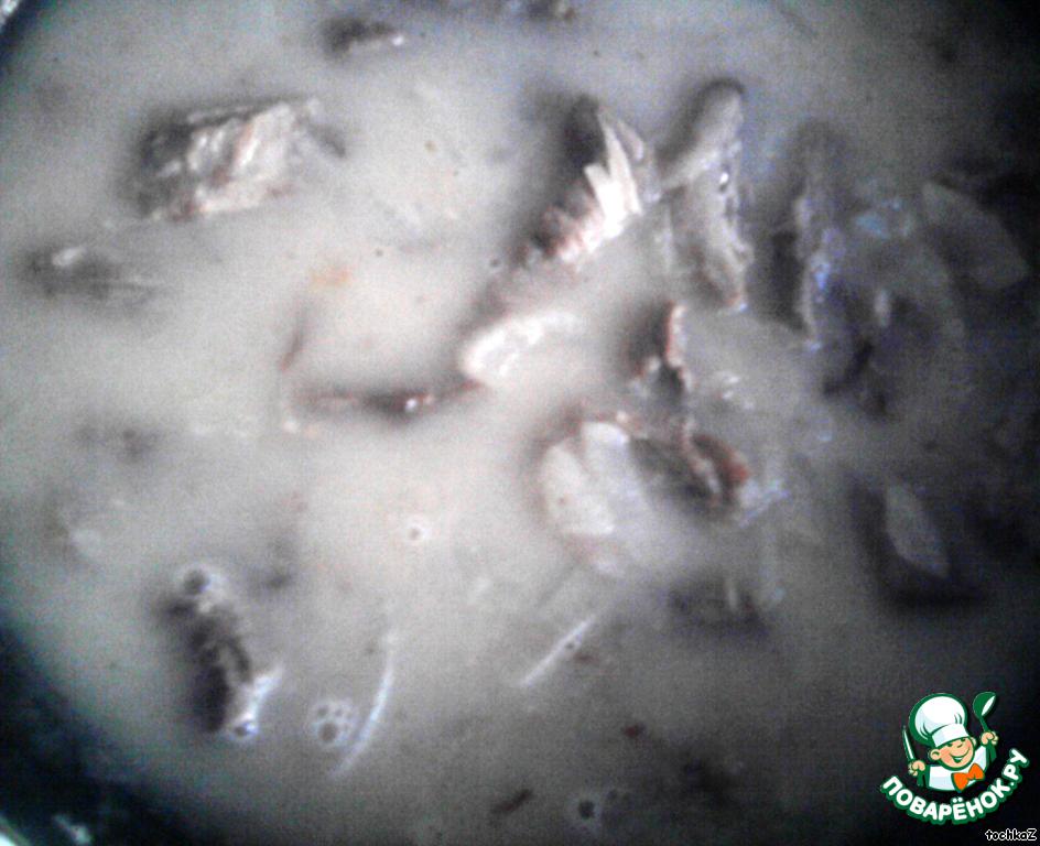 На освободившееся место насыпать 2 ст.л. муки, разровнять и немного обжарить, перемешивая деревянной лопаткой.