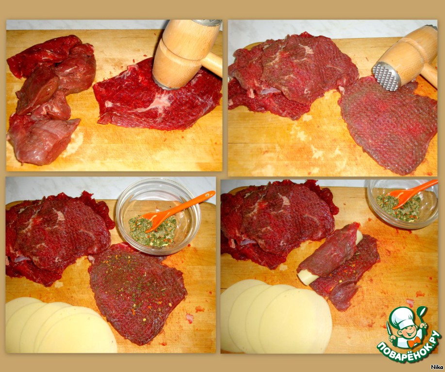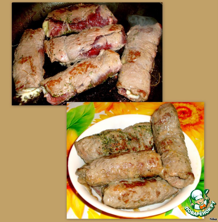 Говядину отбить, посыпать каждый кусочек приправами, перцем. Положить сыр и скрутить в рулетик. Рулетики перевязать ниткой, чтобы во время жарки не раскрутились.