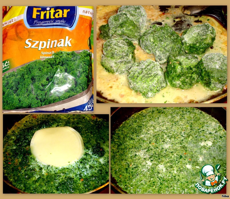 Берем 100 г молока и 100 г воды. В пачке 450 г шпината. Возьмём 2/3 части.