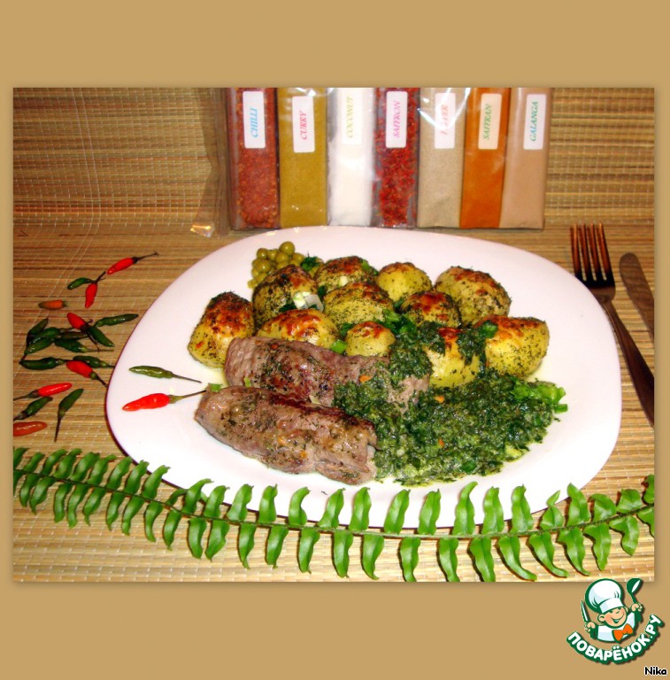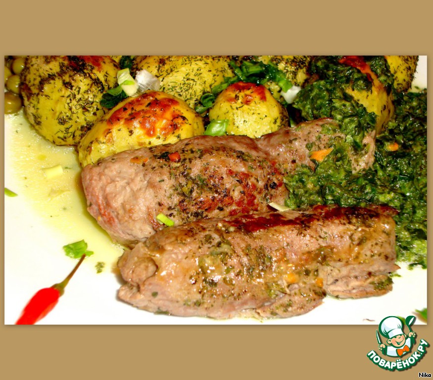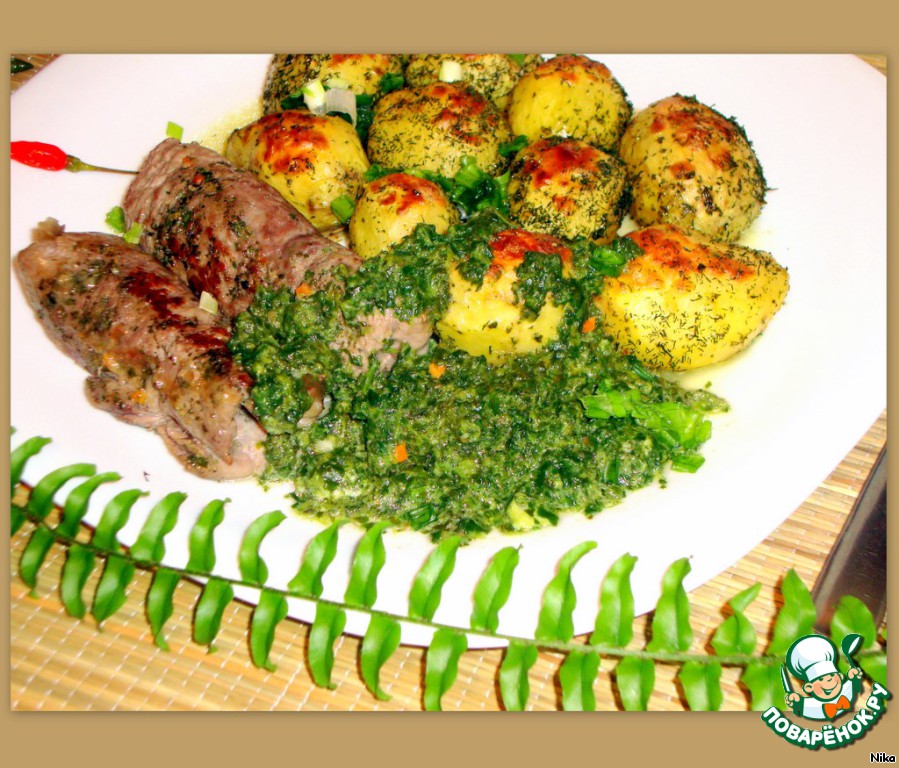 | Говяжьи рулетики с сыром под соусом из шпината. |