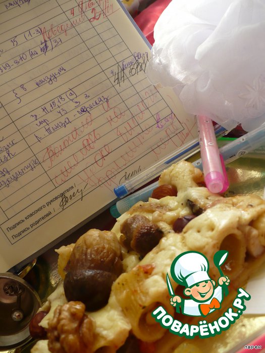 Сверху посыпаем брынзу. Ставим в разогретую до 200 град. духовку. Выпекаем 15-20 минут. За 5-10 минут до окончания выпечки можно посыпать орехами