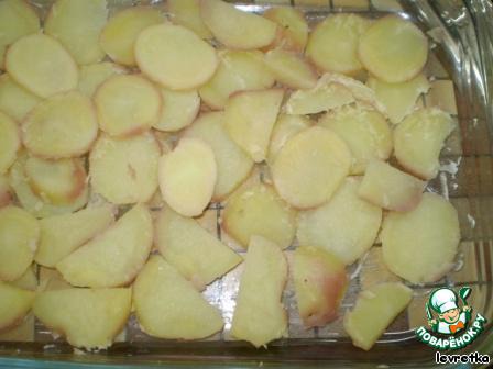 Отварим картофель в мундире, почистим, порежем кольцами примерно 0,5 см. Противень обильно промажем маслом и в него выложим весь картофель, сверху немного посолить.