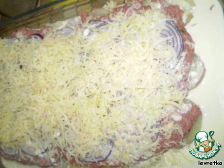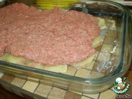 Затем аккуратно фарш выложить на картофель пластом.