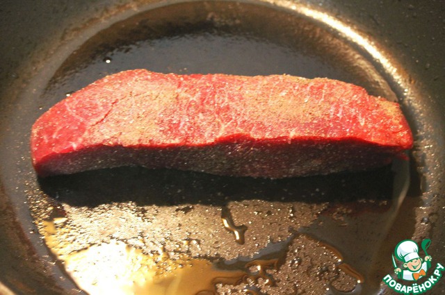 Говяжью вырезку посолить, поперчить и обжарить со всех сторон на растительном масле