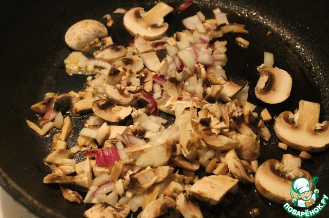 Шампиньоны и лук репчатый мелко порезать, посолить, поперчить, обжарить на сковороде в масле в котором жарилось мясо