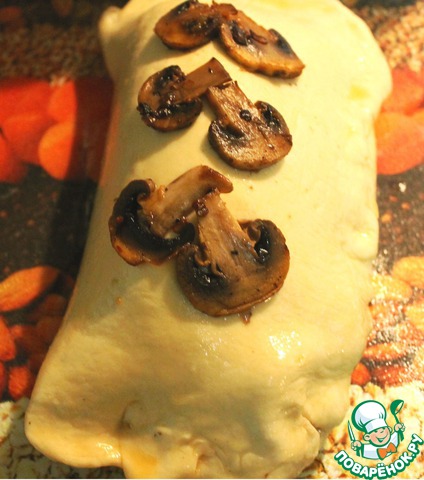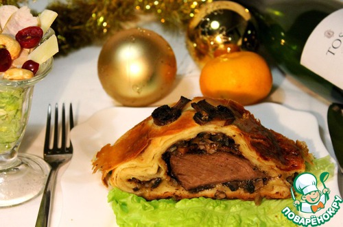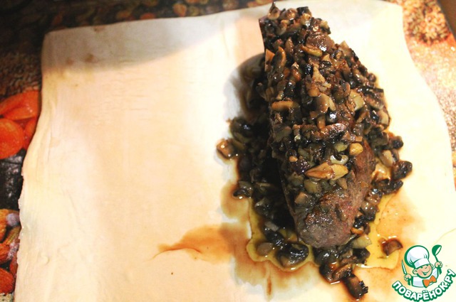 Пласт слоеного теста раскатать в 2 раза больше, чем кусок мяса, выложить на его край половину обжареных грибов с луком, на них уложить кусок мяса, сверху опять положить грибы