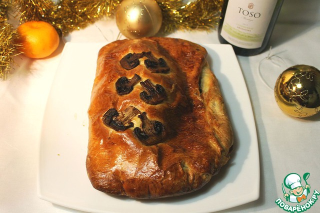 Нарезать горячим и незамедлительно подавать. Сочное мясо, ароматные грибы и нежное слоеное тесто. Вкусноооооооо