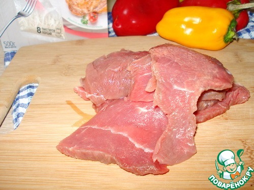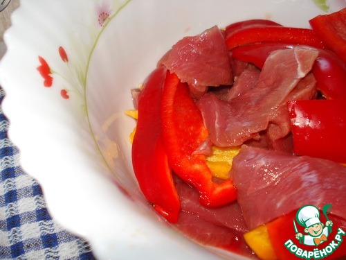 Говядину нарезаем тонкими полосками. Болгарский перец тоже полосками.