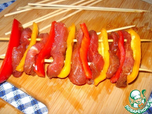 Разделим мясо и перец примерно на 4 порции, нанижим каждую на 2 деревянные шпажки. В разогретой духовке (230 градусов), готовим шашлычки по 4-5 минут с каждой стороны.